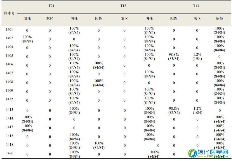 一家使用 Hiseq 2500 的實驗室報告了 1405 和 1413 號樣本(預期結果為 T13 陽性)“臨界/灰區(qū)”的結果。其他平臺所有實驗室檢測結果均與預期結果相符,無假陰性和假陽性結果。