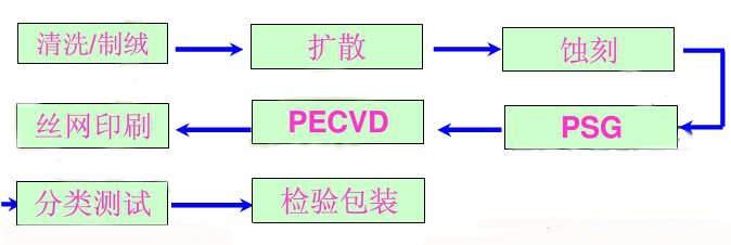 晶體硅太陽能組件的優(yōu)劣取決于每塊電池板的好壞。因此每塊電池板的質(zhì)量至關(guān)重要。以下是電池板生產(chǎn)流程圖: