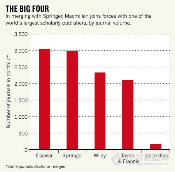 國際學(xué)術(shù)期刊有四巨頭的說法,分別是Springer (2,987本雜志), Elsevier (3,057本雜志), Wiley (2,339本雜志) and Taylor & Francis (2,105本雜志),本來Elsevier排行老大。但是這次合并將增加自然集團(tuán)的的160雜志,使Springer一下變成期刊數(shù)量的老大,又因?yàn)樽匀挥写罅扛咚綄W(xué)術(shù)期刊,也讓這個(gè)老大在期刊的水平上揚(yáng)眉吐氣了一把。
