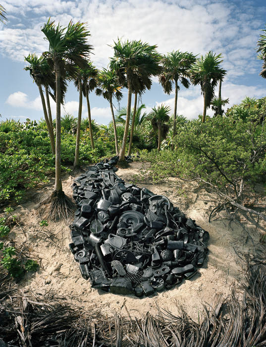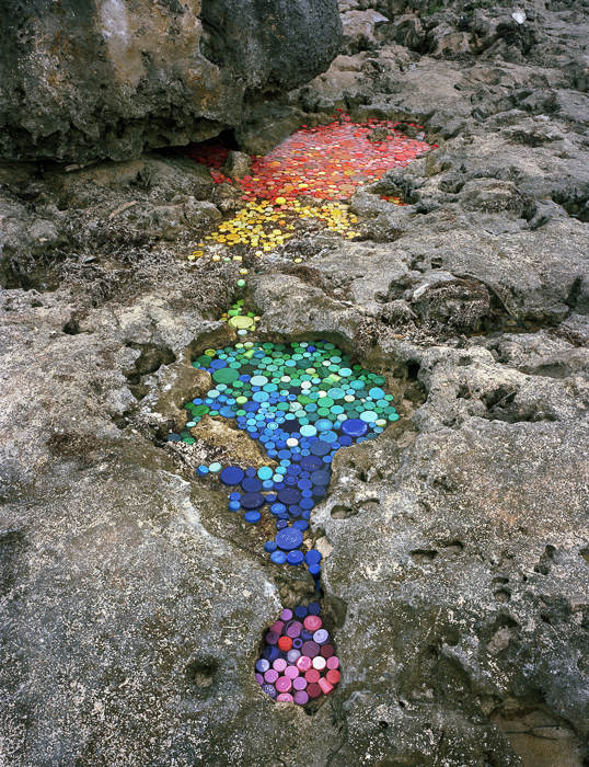 他的藝術(shù)項(xiàng)目“Washed Up: Transforming a Trashed Landscape”目前還在創(chuàng)作中,該項(xiàng)目以墨西哥最大的聯(lián)邦自然保護(hù)區(qū)圣卡安清麗的美景為背景,襯托出五顏六色又讓人看了心里不安的塑料垃圾(他從全世界收集來的)。