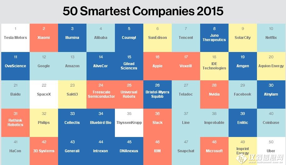近日,美國(guó)權(quán)威雜志《麻省理工科技評(píng)論》(MIT Technology Review)評(píng)出了“2015年度全球創(chuàng)新企業(yè)50強(qiáng)”,生物科技企業(yè)可謂是刷新了榜單記錄,共有14家企業(yè)上榜,依次是Illumina、Counsyl、Juno Therapeutics、OvaScience、AliveCor、吉列德(Gilead Sciences)、安進(jìn)(Amgen)、百時(shí)美施貴寶(Bristol-Myers Squibb)、奧尼蘭姆(Alnylam)、Cellectis、Bluebird Bio、Enlitic、、Intrexon、DNAnexus。