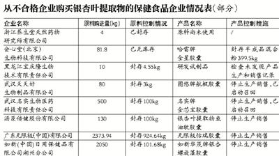國(guó)家食藥總局公布的數(shù)據(jù)顯示:全國(guó)約有203家使用銀杏葉提取物生產(chǎn)保健食品的企業(yè)。其中在產(chǎn)企業(yè)129家,停產(chǎn)74家。初步查明,在產(chǎn)企業(yè)中,有12家企業(yè)購(gòu)進(jìn)使用不合格銀杏葉提取物原料。查出涉嫌不合格保健食品30.864噸,目前已召回產(chǎn)品10.4噸,銷毀0.024噸,下架、封存20.44噸。