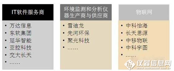 綜合來講,目前智慧環(huán)保市場主體IT軟件服務(wù)商涉足領(lǐng)域相對廣泛,環(huán)境監(jiān)測和儀器廠商環(huán)保相關(guān)領(lǐng)域科研技術(shù)實力雄厚,物聯(lián)網(wǎng)企業(yè)GIS實力較強(qiáng),各有所長。