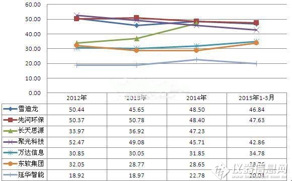 結(jié)合2012年-2014年,主要上市企業(yè)的毛利率來看,2014年各企業(yè)毛利率均在20%以上,表明智慧環(huán)保行業(yè)企業(yè)整體盈利水平較高。其中雪迪龍、先河環(huán)保、長天思源、聚光科技等環(huán)境監(jiān)測企業(yè)和物聯(lián)網(wǎng)企業(yè)毛利率水平最高,均在45%以上;其次為軟件服務(wù)商企業(yè),如萬達(dá)信息、東軟集團(tuán)和延華智能。
