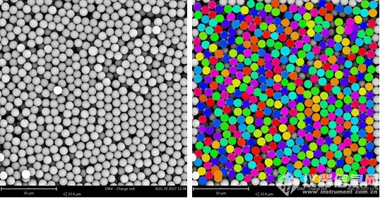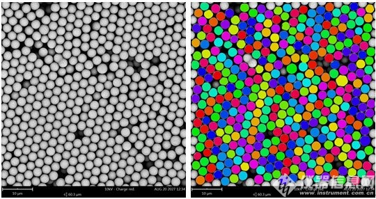 在使用顆粒統(tǒng)計(jì)分析測(cè)量系統(tǒng)之前,先借助掃描電鏡觀察 PS 聚苯乙烯小球的微觀形貌。這個(gè)過(guò)程類(lèi)似于搜集樣本,借助 Phenom 飛納電鏡的光學(xué)導(dǎo)航,自動(dòng)馬達(dá)樣品臺(tái),找樣的過(guò)程非常簡(jiǎn)單。光學(xué)導(dǎo)航相當(dāng)于有了地圖,從而有了找到最佳位置的方向,自動(dòng)馬達(dá)樣品臺(tái)可以在瞬間將視野移動(dòng)到需要觀察位置,只需點(diǎn)擊該位置一次。借助 Phenom 飛納電鏡顆粒統(tǒng)計(jì)分析測(cè)量系統(tǒng)可以一次處理大量數(shù)據(jù),該軟件最多可以一次讀取 400 張掃描電鏡圖片,完成對(duì)所有圖片的分析統(tǒng)計(jì),給出統(tǒng)計(jì)結(jié)果的圖表報(bào)告。如果一次需要幾百?gòu)垝呙鑸D片作為樣本的話,不用擔(dān)心拍照取照時(shí)間過(guò)長(zhǎng),結(jié)合 Phenom 飛納電鏡超大視野全景拼圖,可以自動(dòng)完成拍照取照的功能,原因是飛納電鏡有光學(xué)導(dǎo)航,自動(dòng)聚焦,和自動(dòng)馬達(dá)樣品臺(tái),這些設(shè)計(jì)通過(guò)計(jì)算機(jī)的指令控制,可以自動(dòng)連續(xù)掃描指定大小區(qū)域,每分鐘可采集超過(guò) 100 張 1024 x 1024 分辨率的圖像,這些圖像自動(dòng)存儲(chǔ)在電腦的指定文件夾內(nèi),同時(shí),這些圖像可以自動(dòng)拼合為一副全景圖像。Phenom 飛納電鏡顆粒統(tǒng)計(jì)分析測(cè)量系統(tǒng)可以快速讀取指定文件夾內(nèi)的圖像,即可以讀取由 Phenom 飛納電鏡超大視野全景拼圖自動(dòng)采集的圖像。因此可以快速處理樣本量大的統(tǒng)計(jì)工作,節(jié)省人力。
