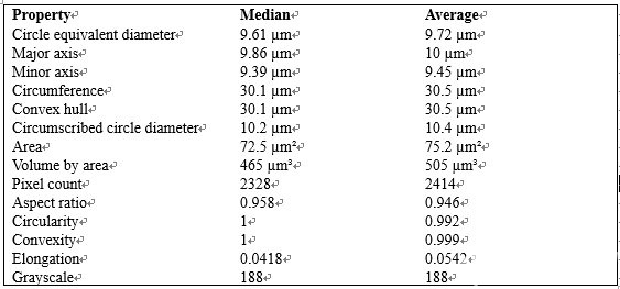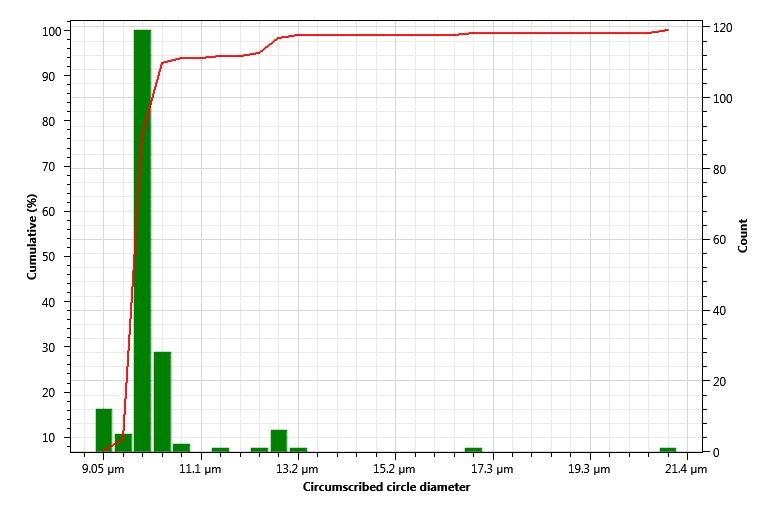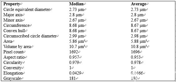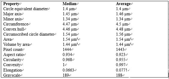 上圖為標(biāo)稱直徑 1.5 μm 的 PS 聚苯乙烯小球的識(shí)別效果,識(shí)別得非常完美,5 秒鐘快速給出結(jié)果,同時(shí)給出關(guān)于該小球的眾多如長(zhǎng)軸,短軸,面積,周長(zhǎng)等參數(shù),大大方便了我們?nèi)プR(shí)別買(mǎi)來(lái)的 PS 聚苯乙烯小球的質(zhì)量。下圖為其眾多參數(shù),可以看到該小球的平均直徑為 1.4 μm,總的來(lái)說(shuō)質(zhì)量還不錯(cuò)。