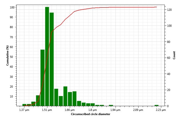 并且該軟件還能給出所有小球直徑的直方圖,直觀方便,如下圖所示可知大部分的顆粒直徑是接近 1.5 μm 的。