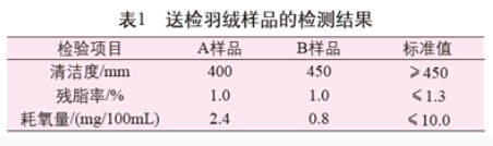 分析白色羽絨服泛黃現(xiàn)象的原因可能出現(xiàn)在兩方面:一是服裝面料,尤其是加熒光增白劑的面料;二是羽絨填充物。為此,本文以兩批洗后泛黃的羽絨服裝進行模擬洗衣試驗。結(jié)果發(fā)現(xiàn),單獨清洗面料,面料沒有發(fā)黃;清洗成衣,出現(xiàn)泛黃的狀況。綜上可知,羽絨填充物對成衣洗后泛黃的影響較大。依據(jù)GB/T 14272—2011《羽絨服裝》標準,我們對填充物的清潔度、耗氧量和殘脂率這3個方面進行考察,兩塊樣品的結(jié)果如表1。