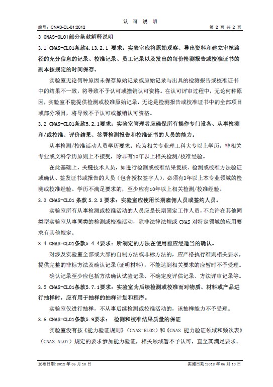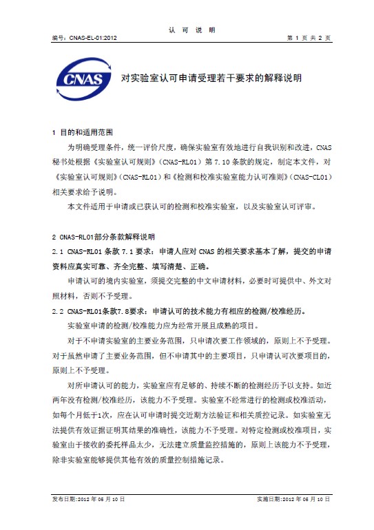 【轉(zhuǎn)】關(guān)于發(fā)布實(shí)施CNAS-EL-01_2012(對(duì)實(shí)驗(yàn)室認(rèn)可申請(qǐng)受理若干要求的解釋說明)的通知