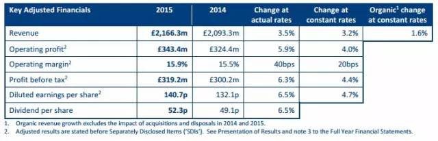 天祥集團(tuán)(Intertek)2015年年報(bào)顯示,2015年全年總營(yíng)業(yè)收入為21.66億英鎊,增長(zhǎng)3.5%。業(yè)績(jī)總體情況及各部分營(yíng)業(yè)收入如下: