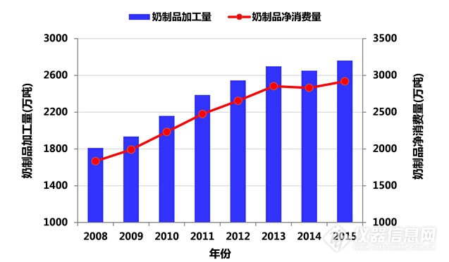 2008~2015年我國奶制品加工量和凈消費(fèi)量