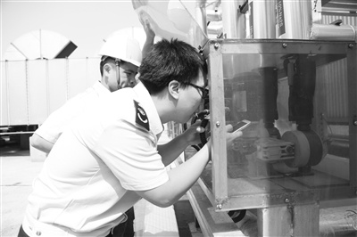 圖為執(zhí)法人員在檢查VOCs治理設(shè)備運(yùn)行情況