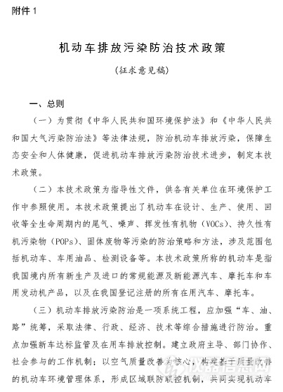 關(guān)于征求《機(jī)動車污染防治技術(shù)政策(征求意見稿)》意見的函
