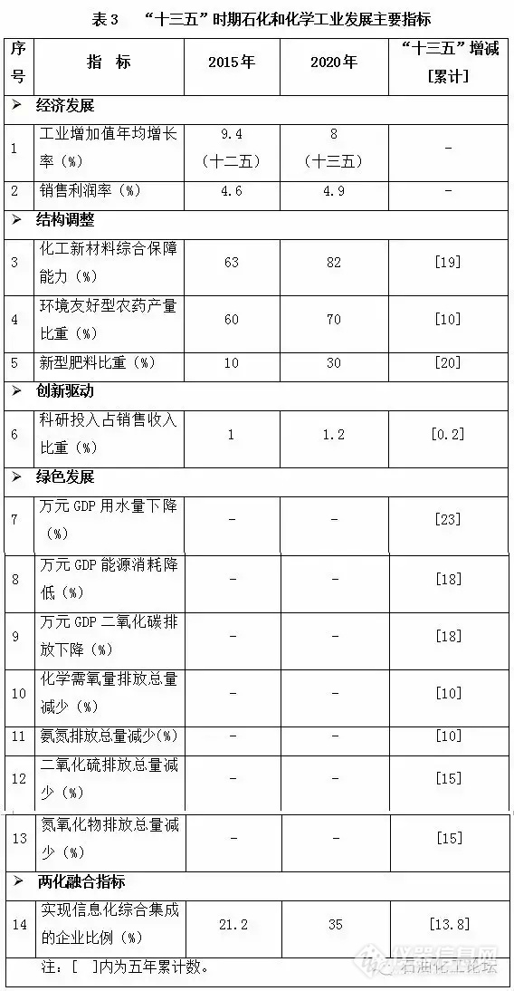 1.經(jīng)濟發(fā)展目標。“十三五”期間石化和化學工業(yè)增加值年均增長8%,銷售利潤率小幅提高,2020年達到4.9%。