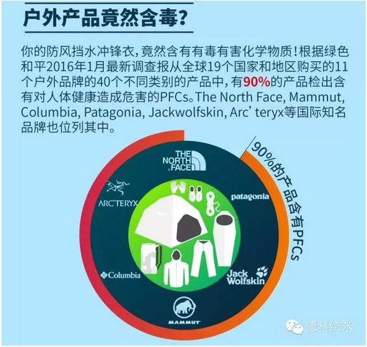 因為具有防水、抗污的功用,全氟化合物被廣泛用于野外的衣物、帳子、睡袋、浴簾、鞋靴、地毯和家私等紡織制品中。