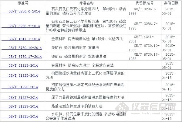 9月30日,中國(guó)國(guó)家標(biāo)準(zhǔn)化管理委員會(huì)公布《原子力顯微鏡測(cè)量濺射薄膜表面粗糙度的方法》等70項(xiàng)標(biāo)準(zhǔn)。其中與科學(xué)儀器及相關(guān)檢測(cè)所涉及的標(biāo)準(zhǔn)摘選如下: