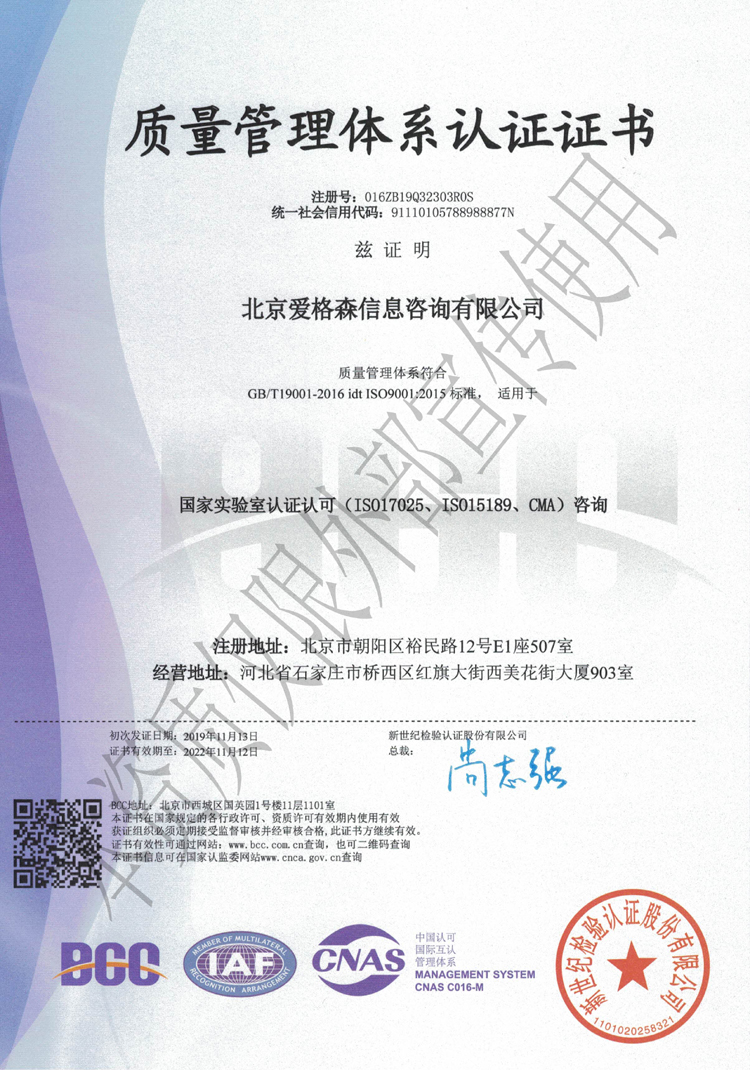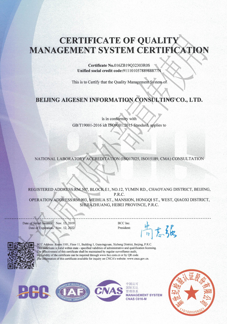 該證書的取得,既是對我公司在各項管理工作中依照質量體系規(guī)范化、標準化辦公的一次全面檢測,也是公司下一步可持續(xù)、健康穩(wěn)定發(fā)展的重要保證,同時也提升了公司為客戶提供優(yōu)質服務的能力。在這里感謝公司的新老客戶對我們工作的支持和認可,我們也必將用更加規(guī)范化的工作標準,更加昂揚的工作熱情為您提供更加優(yōu)質的服務!