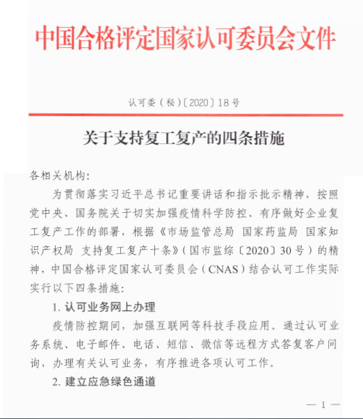 今天,中國(guó)合格評(píng)定國(guó)家認(rèn)可委員會(huì)(CNAS)發(fā)布關(guān)于支持復(fù)工復(fù)產(chǎn)的四條措施。其中一條為減免湖北地區(qū)相關(guān)認(rèn)可技術(shù)服務(wù)收費(fèi)。