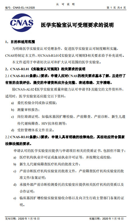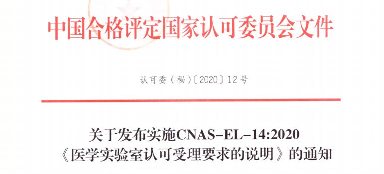 為明確醫(yī)學(xué)實驗室認(rèn)可受理條件,促進(jìn)醫(yī)學(xué)實驗室認(rèn)可制度順利實施,中國合格評定國家認(rèn)可委員會(CNAS)組織制定了CNAS-EL-14:2020《醫(yī)學(xué)實驗室認(rèn)可受理要求的說明》,對CNAS-RL01《實驗室認(rèn)可規(guī)則》第6章中關(guān)于認(rèn)可條件的相關(guān)要求進(jìn)行了說明。