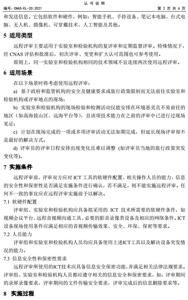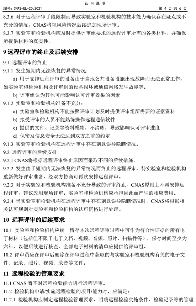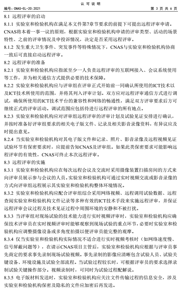 認(rèn)可規(guī)范文件CNAS-EL-20:2021《實(shí)驗(yàn)室和檢驗(yàn)機(jī)構(gòu)認(rèn)可遠(yuǎn)程評(píng)審的應(yīng)用說(shuō)明》已于去年6月正式發(fā)布實(shí)施,該文件用于規(guī)范并指導(dǎo)實(shí)驗(yàn)室和檢驗(yàn)機(jī)構(gòu)認(rèn)可評(píng)審過(guò)程中對(duì)遠(yuǎn)程評(píng)審的應(yīng)用及實(shí)施活動(dòng)。
