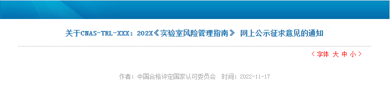 中國(guó)合格評(píng)定國(guó)家認(rèn)可中心(CNAS)組織編制了技術(shù)報(bào)告《實(shí)驗(yàn)室風(fēng)險(xiǎn)管理指南》。目前已完成文件征求意見稿,現(xiàn)于網(wǎng)上公示征求意見。