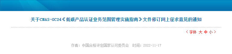 為更好地適應(yīng)低碳產(chǎn)品認(rèn)證機(jī)構(gòu)認(rèn)可工作發(fā)展,中國(guó)合格評(píng)定國(guó)家認(rèn)可委員會(huì)(CNAS)秘書處組織對(duì)CNAS-GC24《低碳產(chǎn)品認(rèn)證業(yè)務(wù)范圍管理實(shí)施指南》進(jìn)行了修訂,目前已完成文件征求意見稿,現(xiàn)于網(wǎng)上公示征求意見。