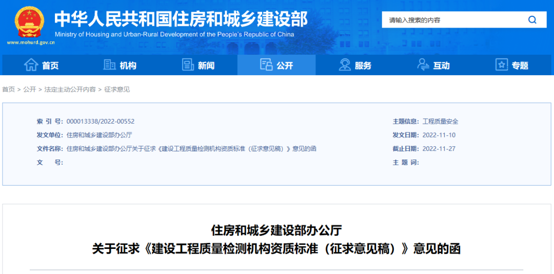 為進(jìn)一步加強(qiáng)建設(shè)工程質(zhì)量檢測機(jī)構(gòu)資質(zhì)管理,推動建設(shè)工程質(zhì)量檢測行業(yè)健康有序發(fā)展,我部研究起草了《建設(shè)工程質(zhì)量檢測機(jī)構(gòu)資質(zhì)標(biāo)準(zhǔn)(征求意見稿)》(見附件),現(xiàn)向社會公開征求意見。有關(guān)單位或個(gè)人可于2022年11月27日前通過以下途徑和方式提出反饋意見: