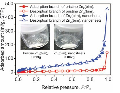 該研究在使用Zn2(bim)4制備Zn2(bim)4分子篩納米片(以下簡(jiǎn)稱納米片)時(shí),使用Autosorb氣體吸附分析儀分別測(cè)試了Zn2(bim)4與納米片的N2(77K)吸脫附等溫線。結(jié)果表明納米片的BET比表面積(112.4 m2/g)遠(yuǎn)高于Zn2(bim)4(19.9 m2/g),并且納米片的吸脫附等溫線屬于IUPAC分級(jí)的Type-II型吸附等溫線、H4類脫附回滯環(huán),這說(shuō)明了材料中存在納米片堆積產(chǎn)生的狹縫形裂隙孔。
