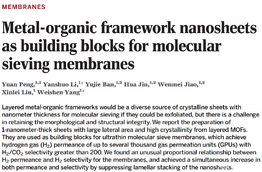 中國(guó)科學(xué)院大連化學(xué)物理研究所楊維慎、李硯碩研究員帶領(lǐng)的團(tuán)隊(duì)近日在美國(guó)《科學(xué)》雜志上發(fā)表了題為“Metal-organic framework nanosheets as building blocks for molecular sieve membranes” (Science 2014 (346) 1356-1359)(詳情點(diǎn)擊:http://www.sciencemag.org/content/346/6215/1356.full)的研究成果,該團(tuán)隊(duì)在國(guó)際上首次合成了二維金屬-有機(jī)框架(Metal-organic frameworks, MOFs)的單分子層厚度的分子篩納米片。據(jù)悉,此研究借助了康塔儀器公司先進(jìn)的Autosorb氣體吸附分析儀,該儀器為研究團(tuán)隊(duì)準(zhǔn)確提供了分子篩納米片的比表面積和孔結(jié)構(gòu)信息。