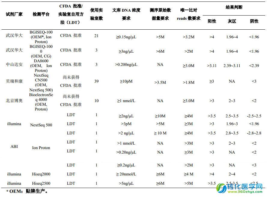 本次質評涉及多個檢測平臺(由于 CFDA 為檢測儀器和配套試劑共同審批,因此本小結中所提及的檢測平臺,除 LDT 外,均同時代表該平臺及相應的配套試劑)。其中有醫(yī)療器械注冊證的檢測平臺:BGISEQ-100(武漢華大基因生物醫(yī)學工程有限公司),BGISEQ-1000(武漢華大基因生物醫(yī)學工程有限公司),DA8600(中山大學達安基因股份有限公司)等。其他檢測平臺有:NextSeq CN500,BioelectronSeq 4000,NextSeq 500,Ion Proton,Hiseq2000, Hiseq 2500,Ion torrent PGM。需要說明的是,沒有醫(yī)療器械注冊證的試劑和儀器,均屬實驗室自用方法(laboratory developed test,LDT),具體不同平臺的參數見下表。