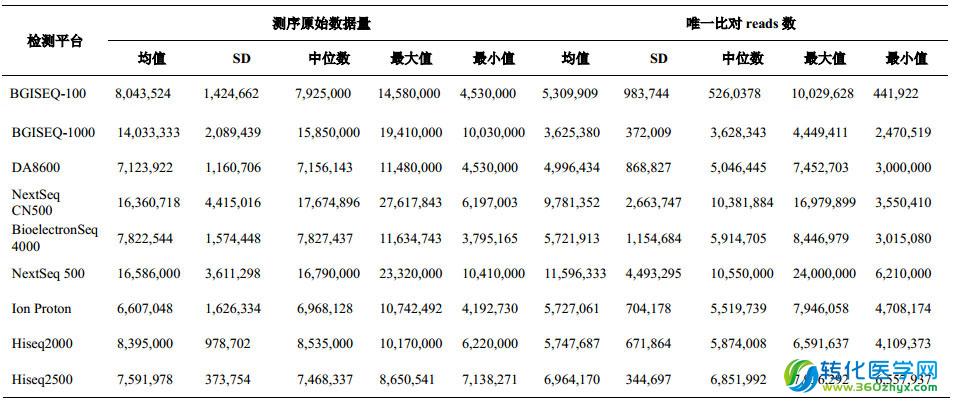 5、各檢測平臺對所有樣本檢測的測序原始數據量和唯一比對 reads 數情況