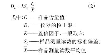 (3)樣品檢出限: 指相對(duì)于空白可檢測(cè)的樣品的最小含量。它定義為三倍空白標(biāo)準(zhǔn)偏差,即3σ空白( 或3S空白)。