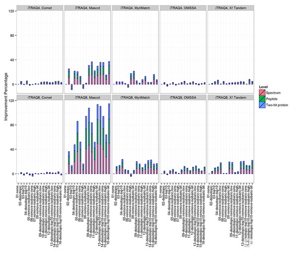 在曾嶸研究員和石瑜教授的共同指導(dǎo)下,盛泉虎,李榮霞和戴捷等人對穩(wěn)定同位素化學(xué)標(biāo)記數(shù)據(jù)首先進(jìn)行了高豐度、高頻率離子的分析,然后進(jìn)行了16種不同組合的數(shù)據(jù)預(yù)處理,最后用5種不同搜索引擎進(jìn)行了數(shù)據(jù)庫搜索分析。研究表明,在高精度質(zhì)譜數(shù)據(jù)中,存在大量穩(wěn)定同位素標(biāo)簽相關(guān)的高豐度、高精度離子。結(jié)合各種預(yù)處理方法,判別和去除這些離子可以提高四標(biāo)數(shù)據(jù)16.3%的鑒定譜圖,13.9%的鑒定肽段以及6.6%的雙肽段鑒定蛋白質(zhì)。對于八標(biāo)復(fù)雜數(shù)據(jù),預(yù)處理方法則可提高50.2%的鑒定譜圖,39.5%的鑒定肽段以及25.2%的雙肽段鑒定蛋白質(zhì)。這表明,標(biāo)記通道的增加,在提高樣品通量的同時,也引入了更多的伴生離子,判別和去除這些離子可以更顯著提高鑒定的敏感性。