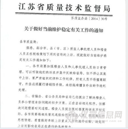 (原標(biāo)題:網(wǎng)曝江蘇質(zhì)監(jiān)局以維穩(wěn)名義發(fā)文強(qiáng)行干預(yù)基層職工維權(quán))