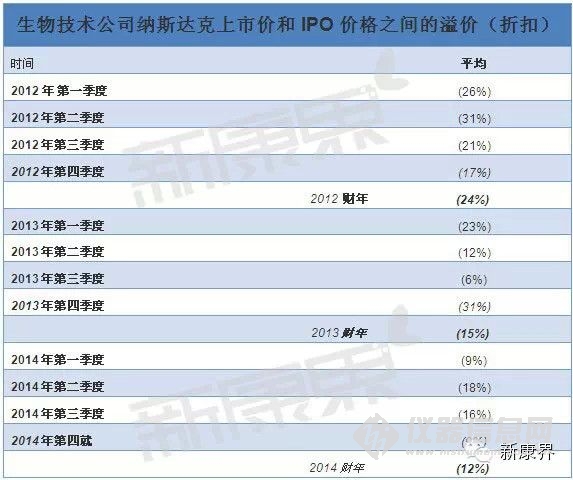 2014年第四季度成功在納斯達(dá)克上市的公司,上市價(jià)和IPO價(jià)之間的平均折扣為12%,比2013年的15%還低,與2012年被迫采取的剃頭式的24%的折扣相比有了顯著改善。