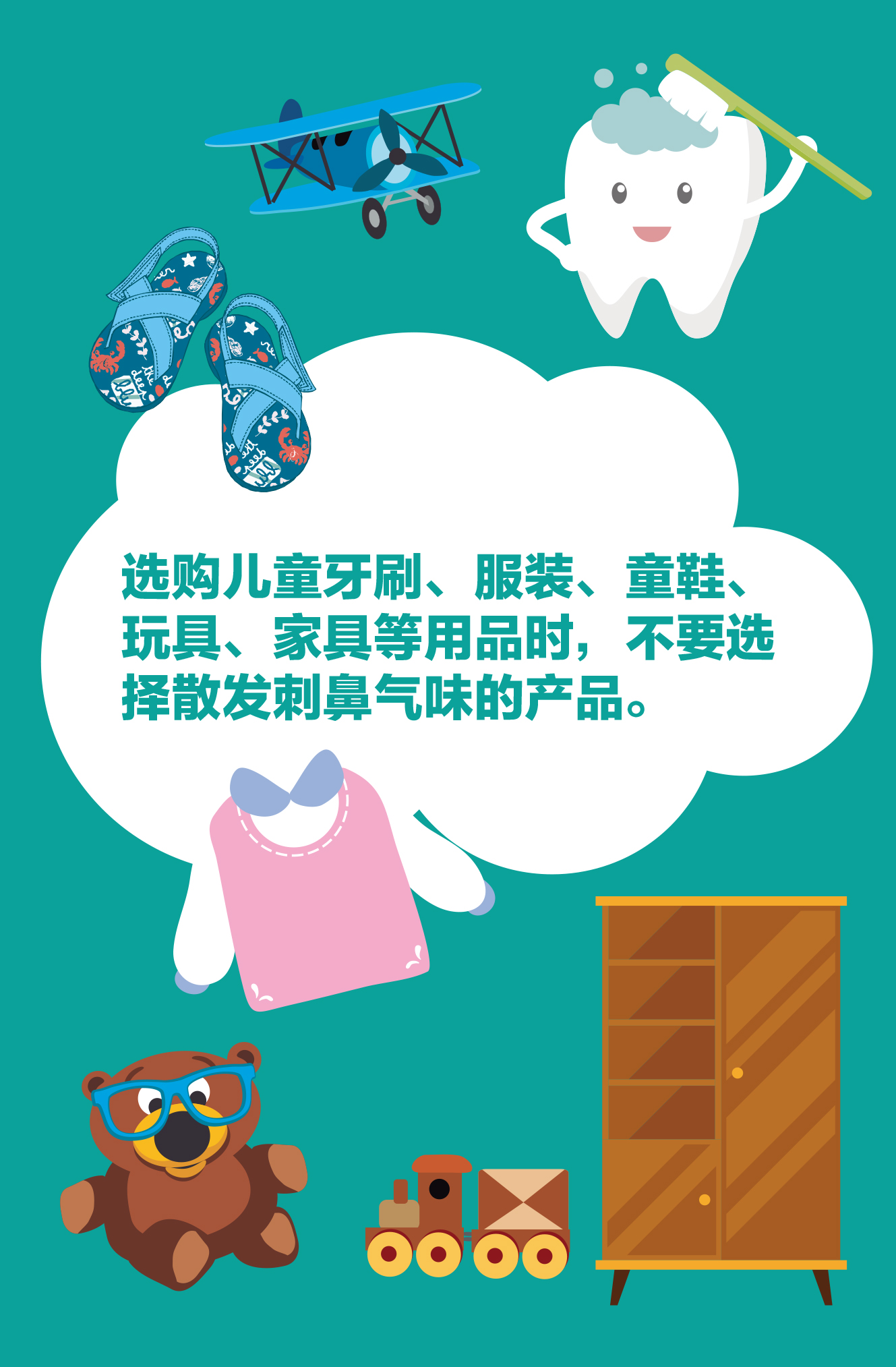 無(wú)論為孩子購(gòu)買兒童服裝、童鞋、家具、玩具、牙刷等兒童用品時(shí),都不要貪圖便宜選擇那些散發(fā)刺鼻氣味的產(chǎn)品,以免對(duì)孩子造成傷害。