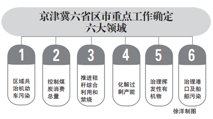 京津冀及周邊地區(qū)大氣污染防治協(xié)作小組第四次會議近日通過了《京津冀及周邊地區(qū)大氣污染聯(lián)防聯(lián)控2015年重點(diǎn)工作》(以下簡稱《重點(diǎn)工作》),明確表示京、津、冀、晉、魯、內(nèi)蒙古六省區(qū)市將在機(jī)動車污染治理、煤炭消費(fèi)總量控制、秸稈綜合利用和禁燒、化解過剩產(chǎn)能、揮發(fā)性有機(jī)物治理、港口及船舶污染治理六大重點(diǎn)領(lǐng)域協(xié)同開展工作。