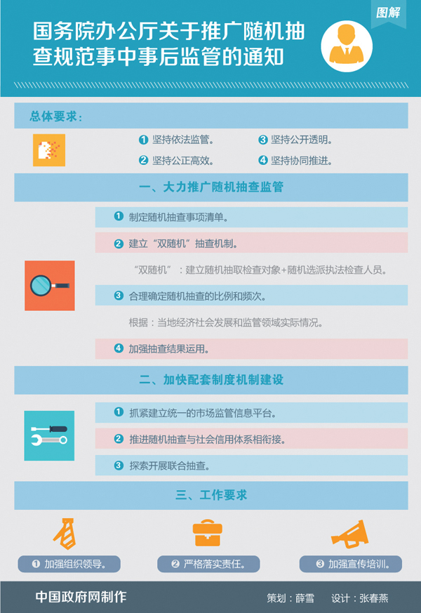 本屆政府成立以來,著力推動簡政放權(quán)、放管結(jié)合、優(yōu)化服務(wù)工作,監(jiān)管的重點也從事前審批向加強事中事后監(jiān)管轉(zhuǎn)變。李克強總理對推廣隨機抽查、規(guī)范市場監(jiān)管高度重視,多次作出重要批示指示,強調(diào)不僅要取消和下放權(quán)力,還要改善和加強政府管理,切實把市場管住、管好,使市場和社會既充滿活力又規(guī)范有序,促進經(jīng)濟持續(xù)健康發(fā)展和社會公平正義?!秶鴦?wù)院關(guān)于印發(fā)2015年推進簡政放權(quán)放管結(jié)合轉(zhuǎn)變政府職能工作方案的通知》(國發(fā)﹝2015﹞29號)也明確將推進監(jiān)管方式創(chuàng)新、推廣隨機抽查辦法列為今年的一項重點工作任務(wù)。