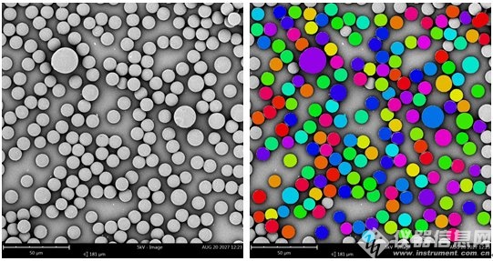 在使用顆粒統(tǒng)計(jì)分析測(cè)量系統(tǒng)之前,先借助掃描電鏡觀察 PS 聚苯乙烯小球的微觀形貌。這個(gè)過(guò)程類(lèi)似于搜集樣本,借助 Phenom 飛納電鏡的光學(xué)導(dǎo)航,自動(dòng)馬達(dá)樣品臺(tái),找樣的過(guò)程非常簡(jiǎn)單。光學(xué)導(dǎo)航相當(dāng)于有了地圖,從而有了找到最佳位置的方向,自動(dòng)馬達(dá)樣品臺(tái)可以在瞬間將視野移動(dòng)到需要觀察位置,只需點(diǎn)擊該位置一次。借助 Phenom 飛納電鏡顆粒統(tǒng)計(jì)分析測(cè)量系統(tǒng)可以一次處理大量數(shù)據(jù),該軟件最多可以一次讀取 400 張掃描電鏡圖片,完成對(duì)所有圖片的分析統(tǒng)計(jì),給出統(tǒng)計(jì)結(jié)果的圖表報(bào)告。如果一次需要幾百?gòu)垝呙鑸D片作為樣本的話,不用擔(dān)心拍照取照時(shí)間過(guò)長(zhǎng),結(jié)合 Phenom 飛納電鏡超大視野全景拼圖,可以自動(dòng)完成拍照取照的功能,原因是飛納電鏡有光學(xué)導(dǎo)航,自動(dòng)聚焦,和自動(dòng)馬達(dá)樣品臺(tái),這些設(shè)計(jì)通過(guò)計(jì)算機(jī)的指令控制,可以自動(dòng)連續(xù)掃描指定大小區(qū)域,每分鐘可采集超過(guò) 100 張 1024 x 1024 分辨率的圖像,這些圖像自動(dòng)存儲(chǔ)在電腦的指定文件夾內(nèi),同時(shí),這些圖像可以自動(dòng)拼合為一副全景圖像。Phenom 飛納電鏡顆粒統(tǒng)計(jì)分析測(cè)量系統(tǒng)可以快速讀取指定文件夾內(nèi)的圖像,即可以讀取由 Phenom 飛納電鏡超大視野全景拼圖自動(dòng)采集的圖像。因此可以快速處理樣本量大的統(tǒng)計(jì)工作,節(jié)省人力。
