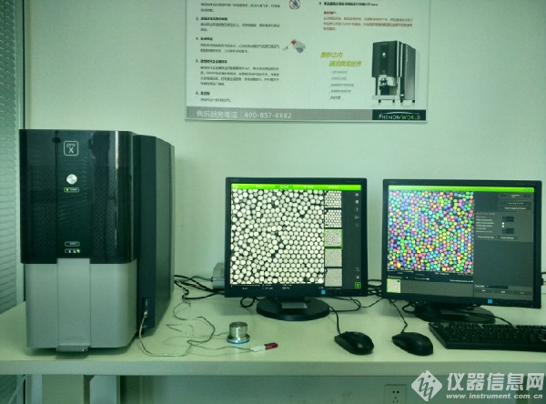 下圖為北京實(shí)驗(yàn)室的 Phenom 飛納臺(tái)式掃描電鏡,小而精致,左邊的顯示器用于呈現(xiàn)樣品在掃描電鏡下的微觀形貌,右邊的電腦及軟件可以做能譜分析,超大視野全景拼圖,3D 粗糙度重建,纖維統(tǒng)計(jì)分析測(cè)量,顆粒統(tǒng)計(jì)分析測(cè)量,孔徑統(tǒng)計(jì)分析測(cè)量等,每個(gè)軟件在完成統(tǒng)計(jì)后,會(huì)輸出相應(yīng)的報(bào)告,本文截取顆粒統(tǒng)計(jì)分析測(cè)量系統(tǒng)的部分報(bào)告說(shuō)明。