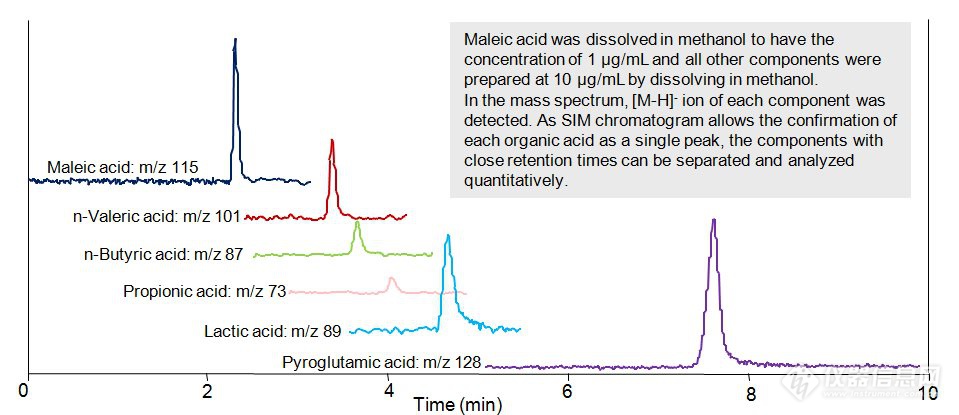 眾所周知,有機(jī)酸是影響食品味道和口感的重要成分,經(jīng)此在研發(fā)、質(zhì)控等部門需要對有機(jī)酸進(jìn)行分析。除食品領(lǐng)域外,制藥、化工、環(huán)境分析、生物工程等諸多領(lǐng)域均需要對有機(jī)酸進(jìn)行分析。在下面,我們將跟大家介紹6種有機(jī)酸的分析實例,使用的是HILIC親水色譜柱和日立最新推出的質(zhì)譜檢測器Chromaster5610進(jìn)行分析。
