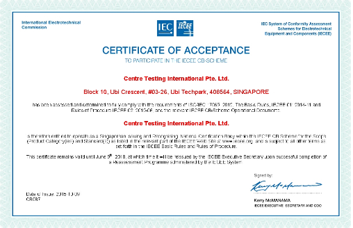 2015年10月9日,經(jīng)國際電工委員會(huì)(IECEE)評(píng)定,新加坡華測(Centre Testing International Pte.Ltd.)成為新加坡發(fā)證/認(rèn)可NCB(Singaporean Issuing and Recognising National Certification Body),CTI深圳實(shí)驗(yàn)室也成為NCB新加坡華測責(zé)任下的CB實(shí)驗(yàn)室(CBTL)。本次認(rèn)可的產(chǎn)品范圍包括電池(BATT)、家用及類似用途設(shè)備(HOUS)、照明設(shè)備(LITE)、信息技術(shù)及辦公設(shè)備(OFF)、安全變壓器及類似設(shè)備(SAFE)、音視頻設(shè)備(TRON)等6大類,標(biāo)準(zhǔn)涉及36項(xiàng)。