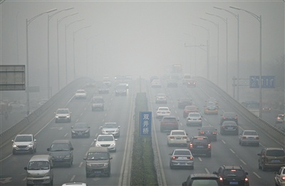 11月30日,霧霾中,雙井橋上能見度明顯不高。