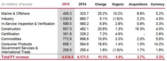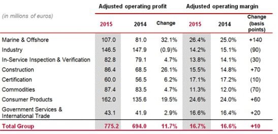 必維國(guó)際檢驗(yàn)集團(tuán)2015年年報(bào)顯示,BV 2015 年總營(yíng)收達(dá)到 46 億歐元,增長(zhǎng) 11.1%;調(diào)整后營(yíng)業(yè)利潤(rùn)達(dá) 7.75 億歐元,增長(zhǎng) 11.7%。各部分營(yíng)業(yè)情況如下: