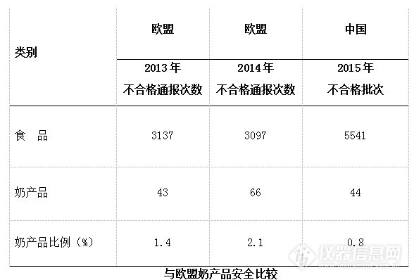 歐盟官方的食品與飼料快速預(yù)警系統(tǒng)(RASFF)2013年年度報告中,食品不合格通報3137起,其中奶產(chǎn)品相關(guān)43起,占1.4%;2014年年度報告中,食品不合格通報3097起,其中奶產(chǎn)品相關(guān)66起,占2.1%。2015年,國家食品藥品監(jiān)督管理總局發(fā)布報告顯示,我國不合格食品5541批次,其中不合格奶產(chǎn)品44批次,不合格奶產(chǎn)品僅占不合格食品的0.8%。