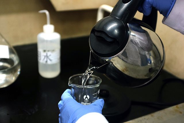 實(shí)驗(yàn)人員往里面加入水(國標(biāo)要求使用醋酸溶劑,此處為實(shí)驗(yàn)演示畫面)。