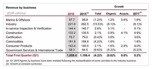 從報(bào)表看,必維第一季度收入排在前列的領(lǐng)域(營(yíng)收過(guò)億歐元)分別是:工業(yè)、商品、在線(xiàn)檢測(cè)與認(rèn)證、消費(fèi)品、建筑。