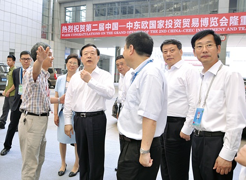 浙江省委書記夏寶龍(左五)在浙洽會(huì)現(xiàn)場(chǎng)聽(tīng)取省質(zhì)監(jiān)局副局長(zhǎng)做“浙江制造”品牌標(biāo)識(shí)說(shuō)明。