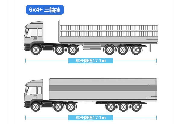 五軸汽車列車,無論是4×2+3軸掛還是6×4+2軸掛,最大總重限值43噸。自新GB1589征求意見稿以來,關于六軸車的總重就一直備受爭議,最終確定為以GB1589中的49噸為準。