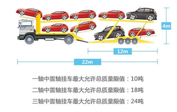 關于轎運車的總重規(guī)定為,一軸中置軸掛車最大允許總質量限值為10噸,而軸中置軸掛車最大允許總質量限值為18噸,三軸中置軸掛車最大允許總質量限值為24噸。